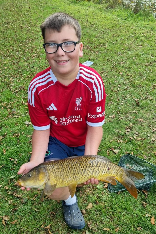 The delight of catching your first carp is a feeling that remains with you for ever. I am sure this young man will not forget this moment. The carp was caught using a size 12 hook and a waggler float, sweet corn bait and some loose feed pellets supplied by the fishery.