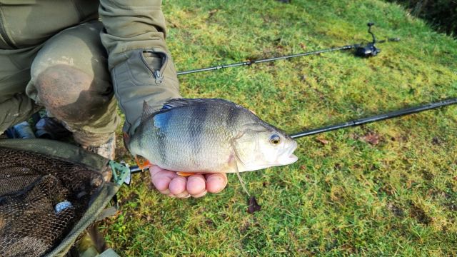 12.02.2026 Its hard to believe it has been a whole month since I posted an update on here, it has been a busy period clearing up ready for spring and strart of the new caravan season. It has also been a quiet period on the fishing front as January normally is. That said those who have ventured out have been catching readily, silvers of very good quality are been caught as are the smaller carp and some lovely perch. It is always nice when new anglers arrive for the first time and are impressed and compliment us on the quality of the fish. As I mentioned the two lads from London just before Christmas were delighted with the quality of the carp. Last weekend it was another two guys from London who were delighted with the quality of the roach and perch in the top lake. The pictures below were from a couple of regular anglers. A perch and a small carp, both were caught on the same method. A method feeder out in deep water with a brightly coloured pellet buried within the feeder which did the trick on this occasion.